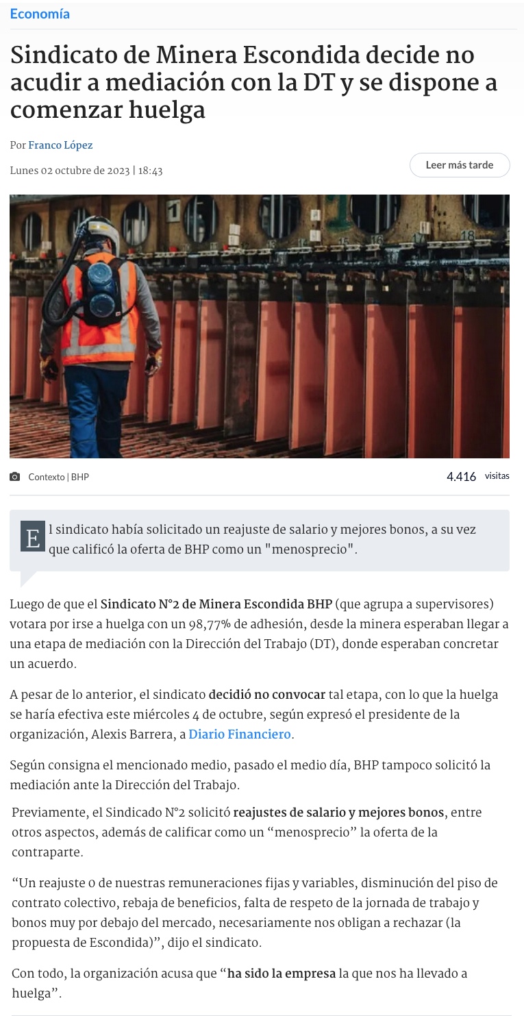 Sindicato de Minera Escondida no activará buenos oficios y huelga partiría este miércoles - (redimin)
