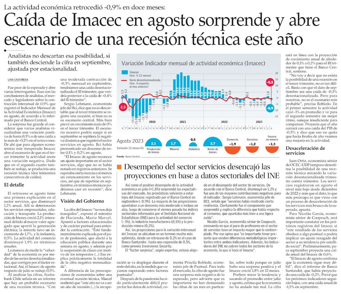 Caída de la economía toma por sorpresa al mercado y termina por confirmar un 2023 sin crecimiento - (Diario Financiero)