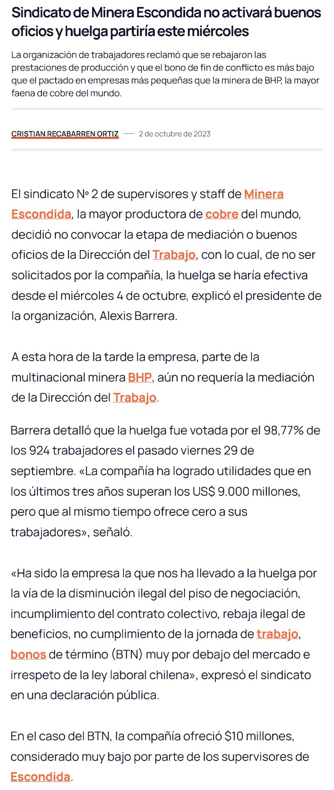 Sindicato de Minera Escondida decide no acudir a mediación con la DT y se dispone a comenzar huelga - (biobiochile online)