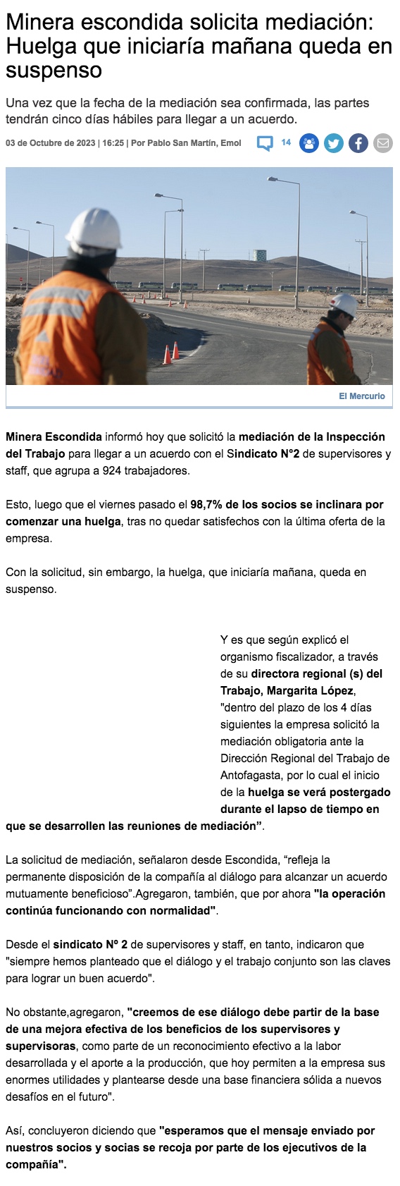 Minera Escondida solicita mediación obligatoria para evitar inicio de la huelga de supervisores - (Pulso Online)