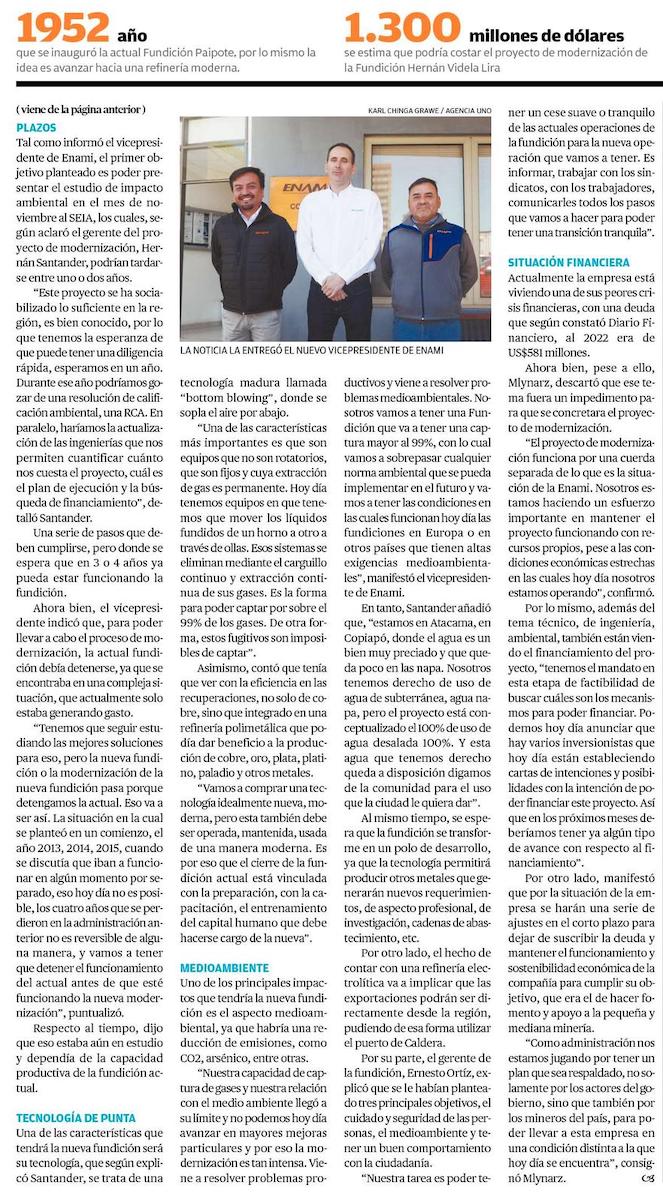 Enami iniciará en noviembre tramitación de proyecto de fundición en Paipote - (El Mercurio de Santiago)