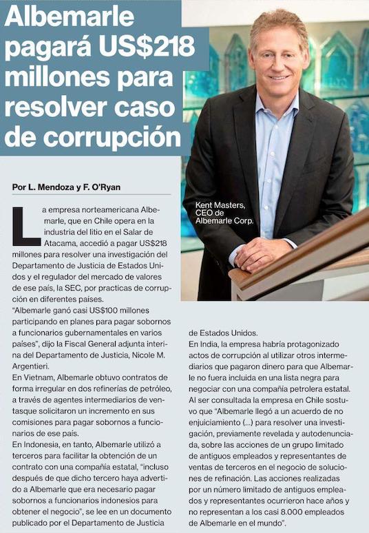 Albemarle, la segunda productora de litio en Chile, acuerda pagar más de US$200 millones en EE.UU. por casos de sobornos en Asia - (Pulso)
