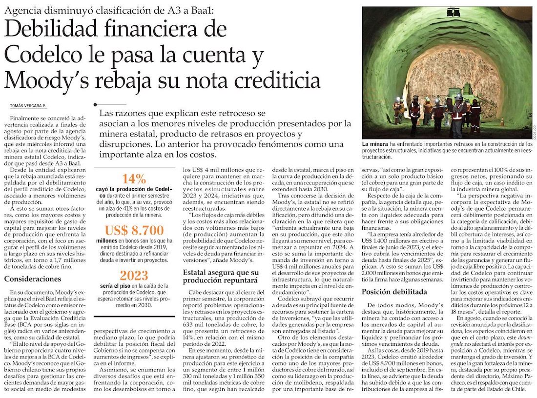 Moody's rebaja clasificación crediticia de Codelco y le asigna perspectiva negativa - (Pulso)