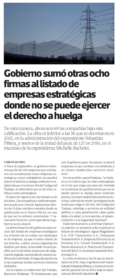 Gobierno suma ocho nuevas empresas a listado de firmas sin derecho a huelga - (Diario Financiero)