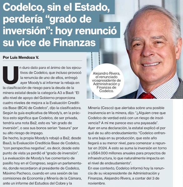 Tras rebaja en la clasificación, la minera estatal anuncia salida del VP de Finanzas - (El Mercurio de Santiago)