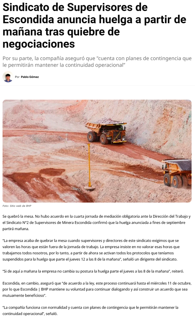 Proceso de mediación obligatoria entre Sindicato de Minera Escondida y BHP concluye sin acuerdos - (diarioangamos)