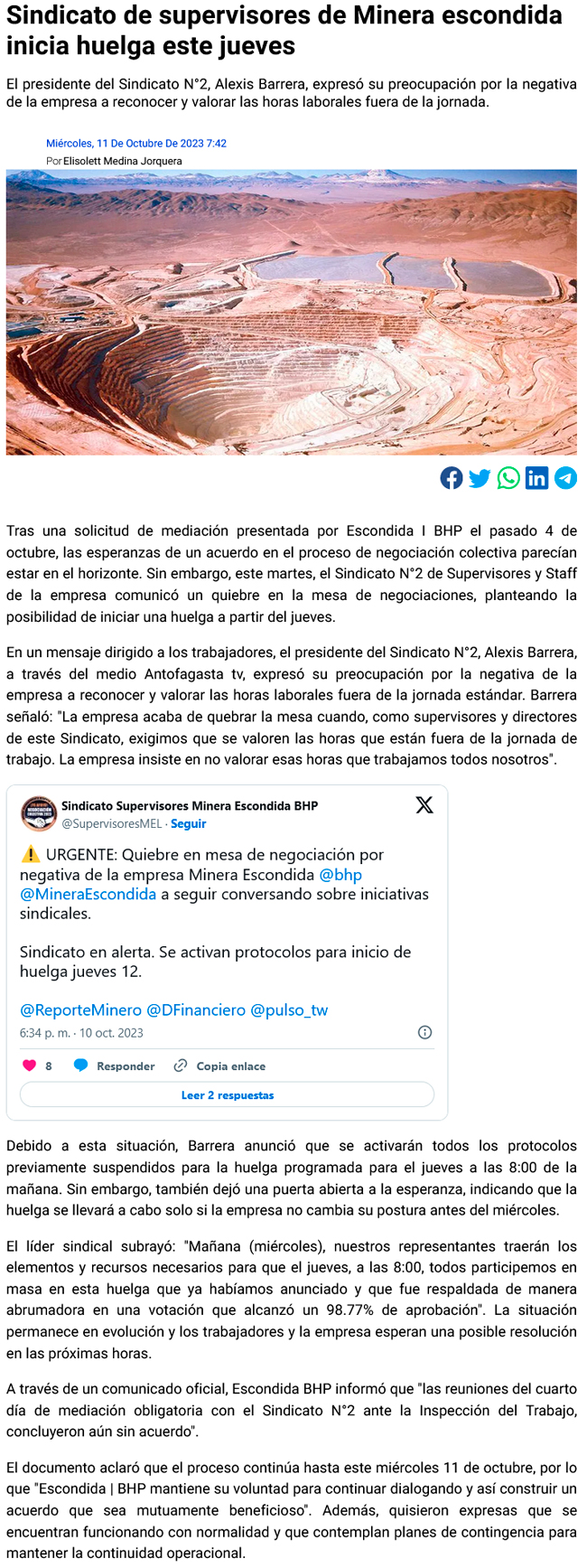 Sindicato de Supervisores de Escondida anuncia huelga a partir de mañana tras quiebre de negociaciones - (timeline)