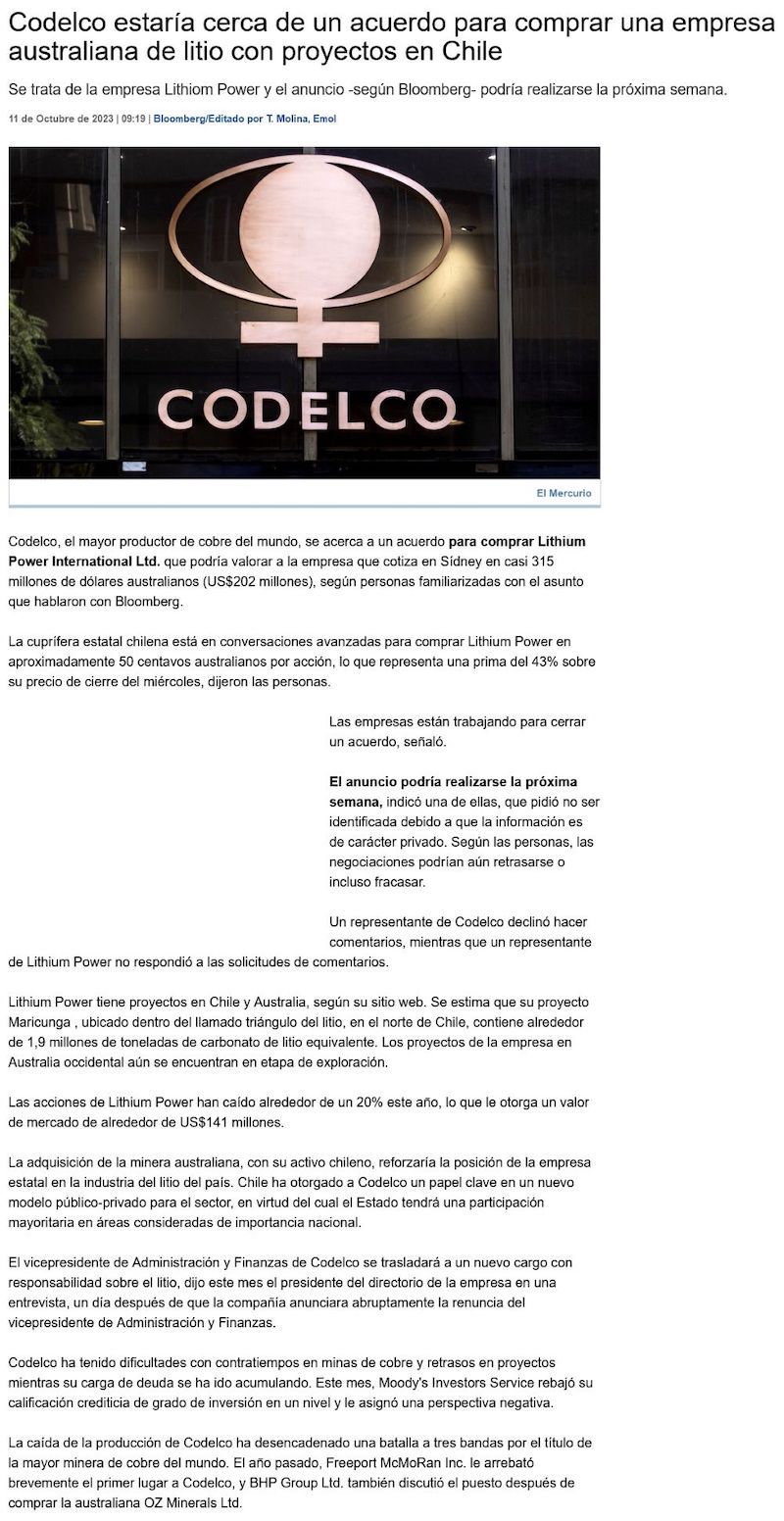 Codelco estaría cerca de un acuerdo para comprar la australiana Lithium Power - (DF Online)