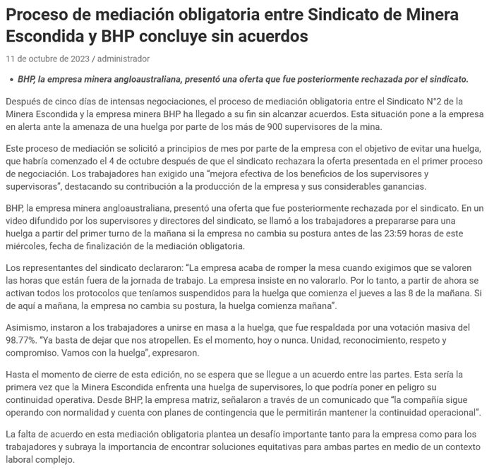 Persiste riesgo de huelga en Escondida después de quiebre en mesa de diálogo - (soyantofagasta)