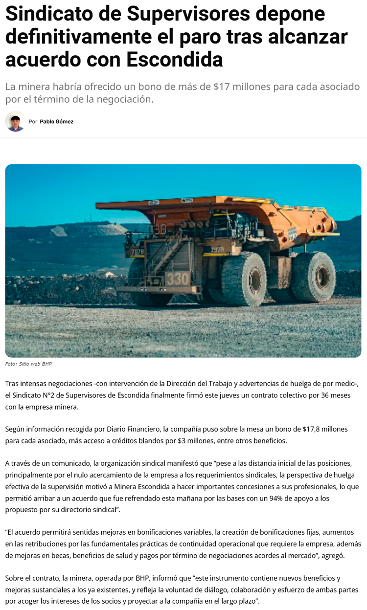Escondida firmó un nuevo contrato colectivo con supervisores y recibirán bono de 17,8 millones - (soyantofagasta)