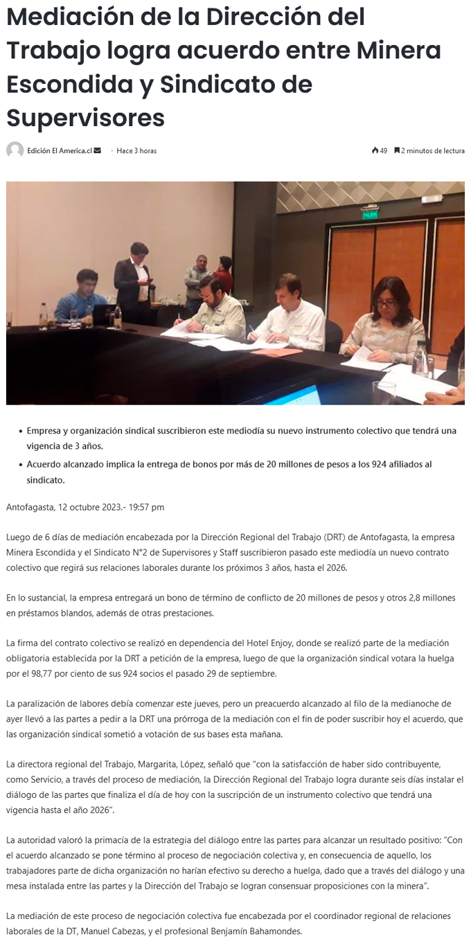 Escondida firmó un nuevo contrato colectivo con supervisores y recibirán bono de 17,8 millones - (soyantofagasta)