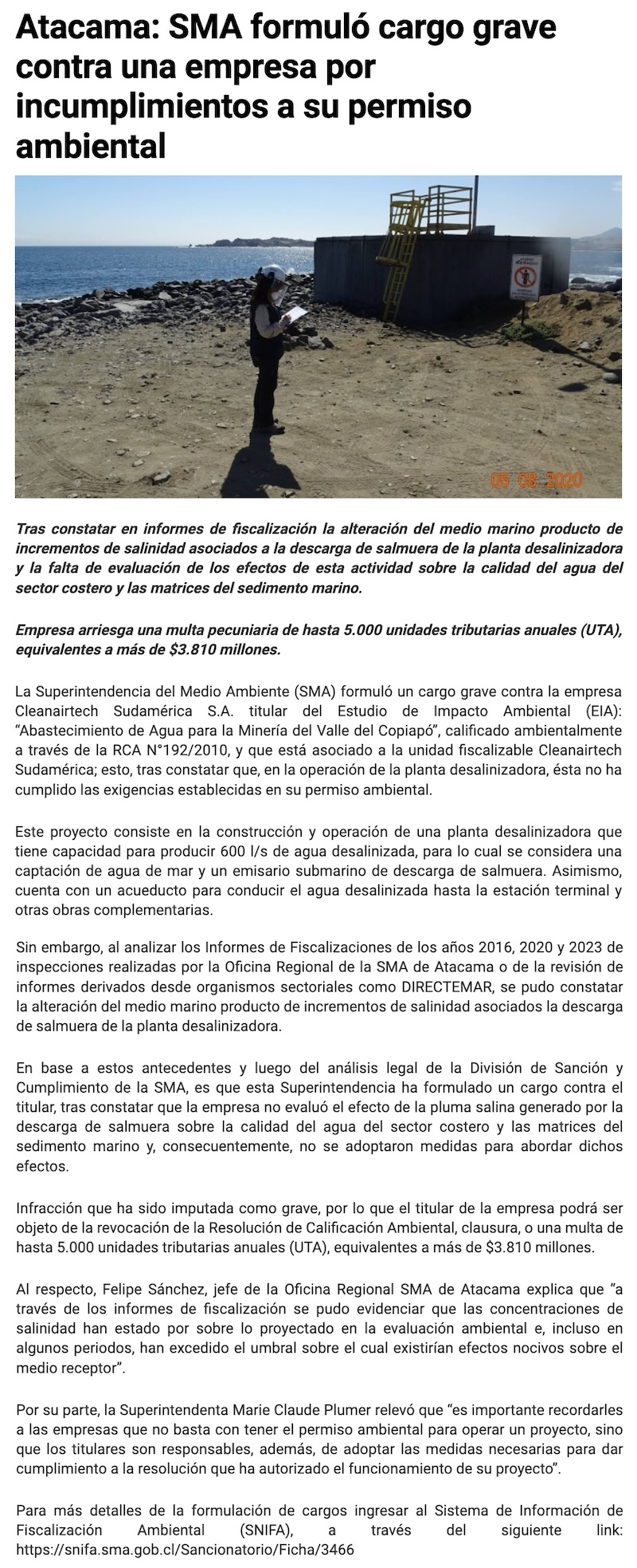 SMA formula cargo grave a planta desaladora - (La Segunda)