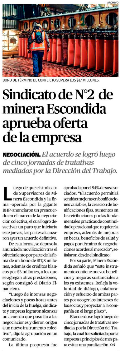 Sindicato N°2 de Minera Escondida aprueba oferta de la empresa - (El Mercurio de Calama)