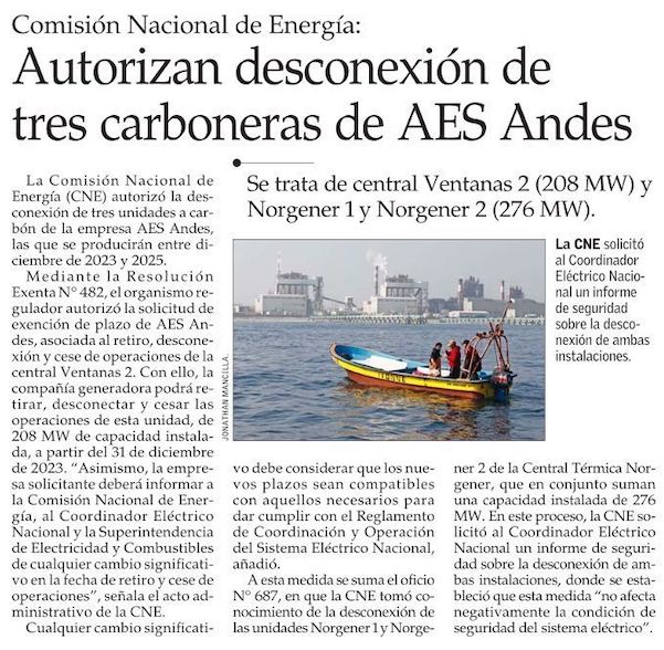 CNE da luz verde final al retiro de tres unidades a carbón de AES Andes que implicarán la desconexión de 484 MW - (DF Online)