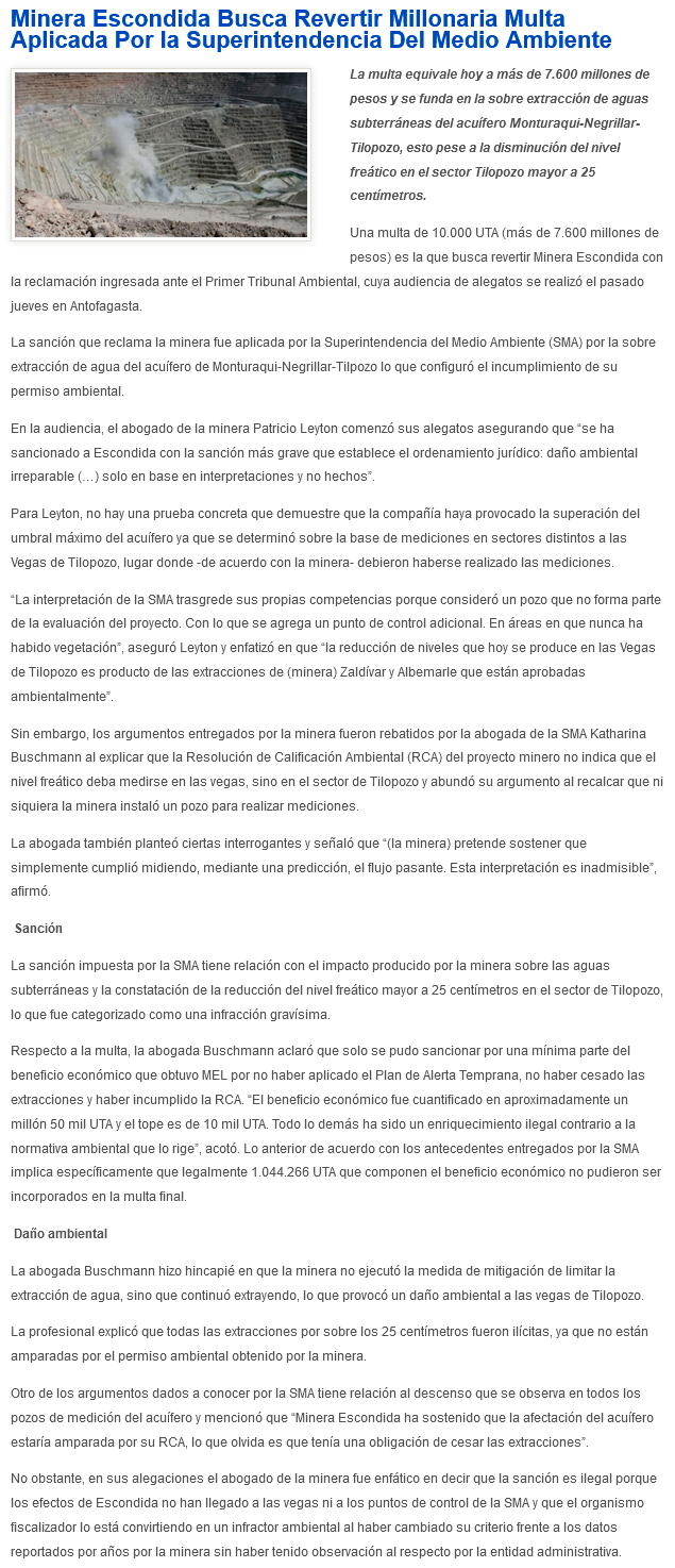 Minera Escondida busca revertir millonaria multa aplicada por la SMA - (cooperativa online)
