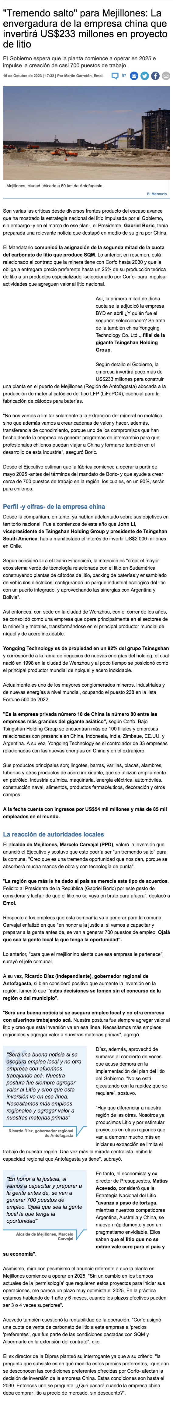 Anuncian inversión de US$233 millones para la instalación de una fábrica de baterías de litio en Mejillones - (El Mercurio de Antofagasta)