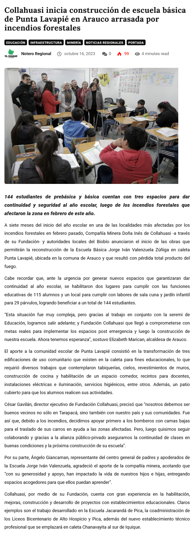 Collahuasi inicia construcción de escuela básica de Punta Lavapié en Arauco - (mch.cl)
