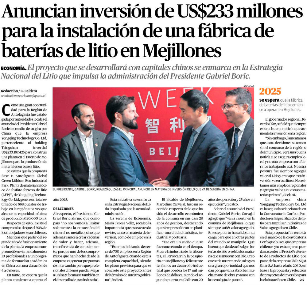 "Tremendo salto" para Mejillones: La envergadura de la empresa china que invertirá US$233 millones en proyecto de litio - (emol)