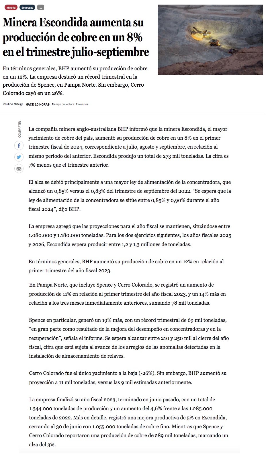 La producción de cobre en la mina Escondida aumentó en un 8% - (reporteminero)