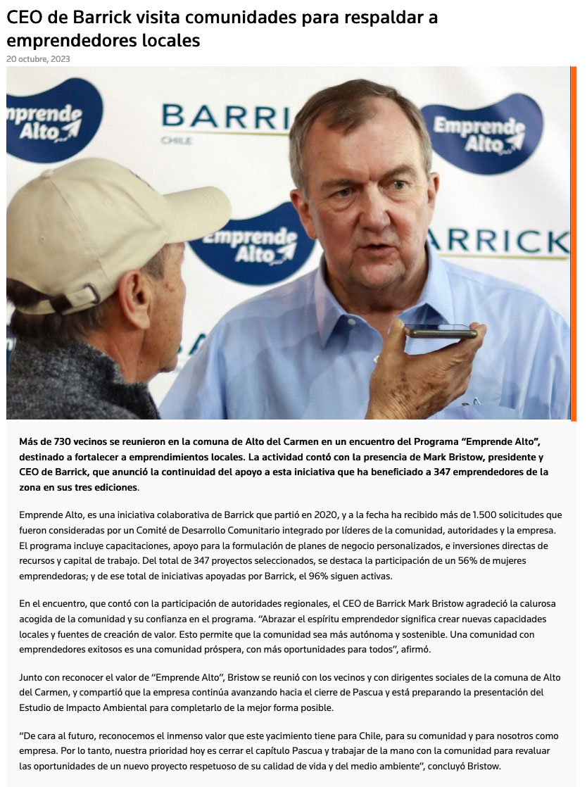 Comunidades en Chile reciben la visita del CEO de Barrick para reforzar el respaldo a los emprendedores locales - (portalminero)