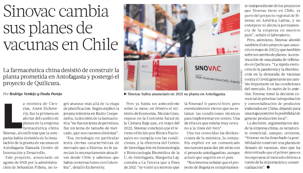 Grau desdramatiza que china Sinovac desistiera de instalarse en Antofagasta - (El Mercurio de Antofagasta)
