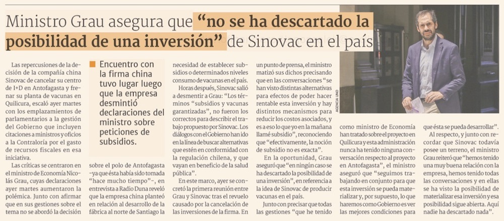 Parlamentarios apuntan contra ministro Grau por gestión de inversiones de Sinovac que no se harán - (El Mercurio de Santiago)
