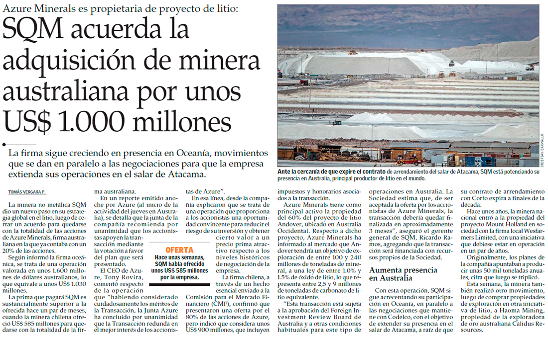 SQM potencia litio en Australia: compra Azure en US$ 900 millones, planea expansión de Mount Holland y tiene nueve proyectos activos - (Diario Financiero)