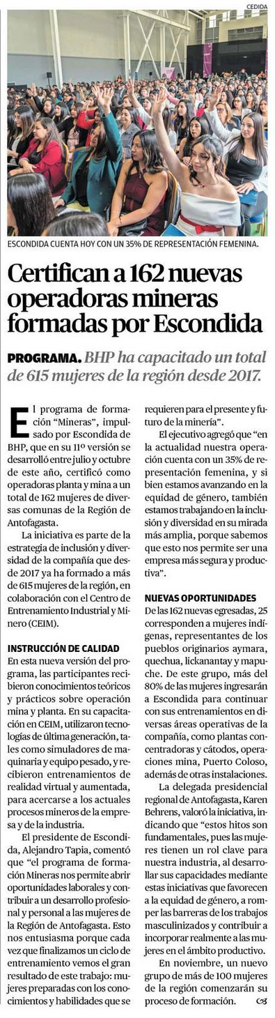 Certifican a 162 nuevas operadoras mineras formadas por Escondida - (El Mercurio de Antofagasta)