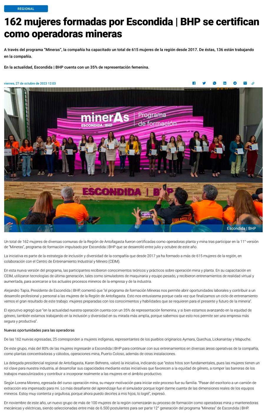 Mineras de Escondida | BHP capacitó a 162 mujeres de la región - (coweb.cl)