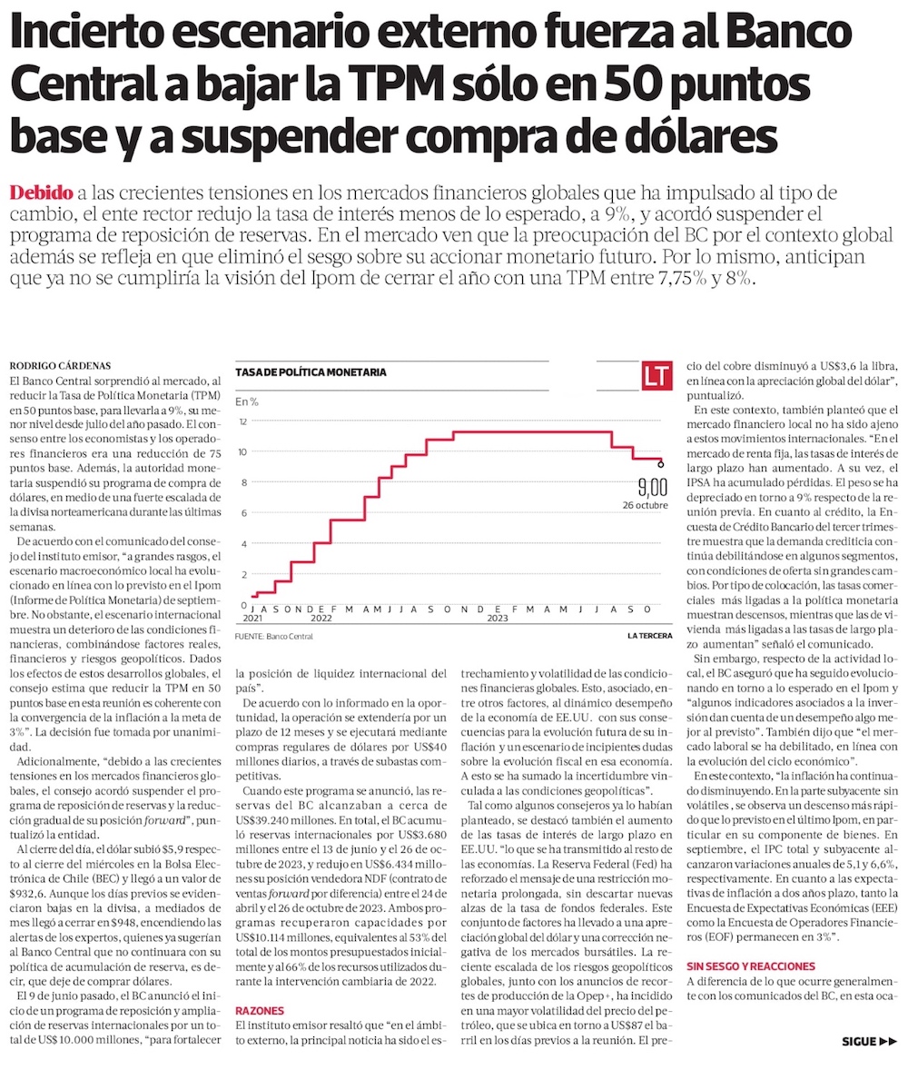 Banco Central baja tasa de interés menos de lo esperado y suspende compra de dólares - (El Mercurio de Santiago)
