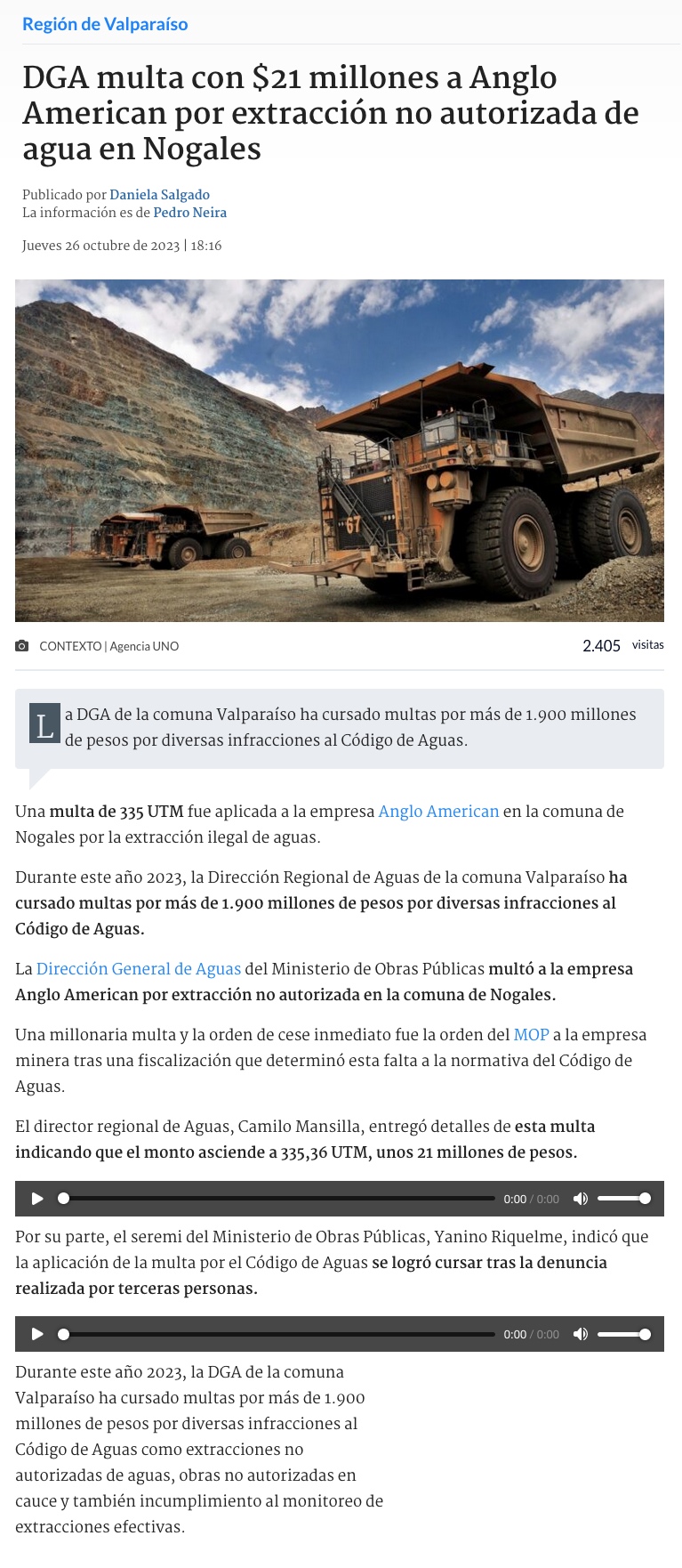 Dirección General de Aguas multó a Anglo American - (El Mercurio de Valparaíso)