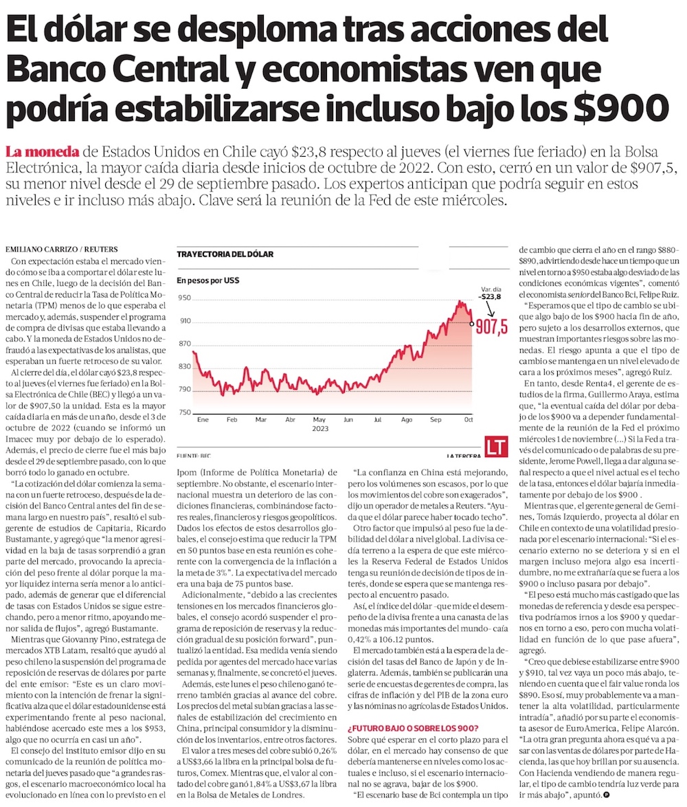 Dólar se desploma $23 y anota su mayor caída en más de un año, tras medidas del BC - (El Mercurio de Santiago)