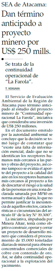SEA de Atacama pone término anticipado a proyecto minero de US$ 250 millones - (DF Online)