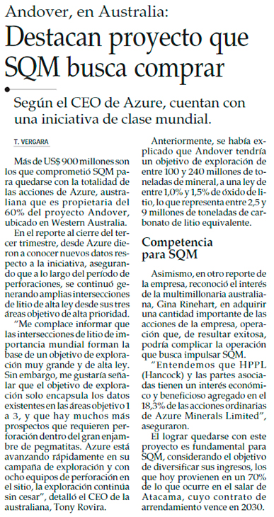 Azure tras las exploraciones de su iniciativa estrella: “Es de los mejores proyectos de litio a nivel mundial” - (Diario Financiero)