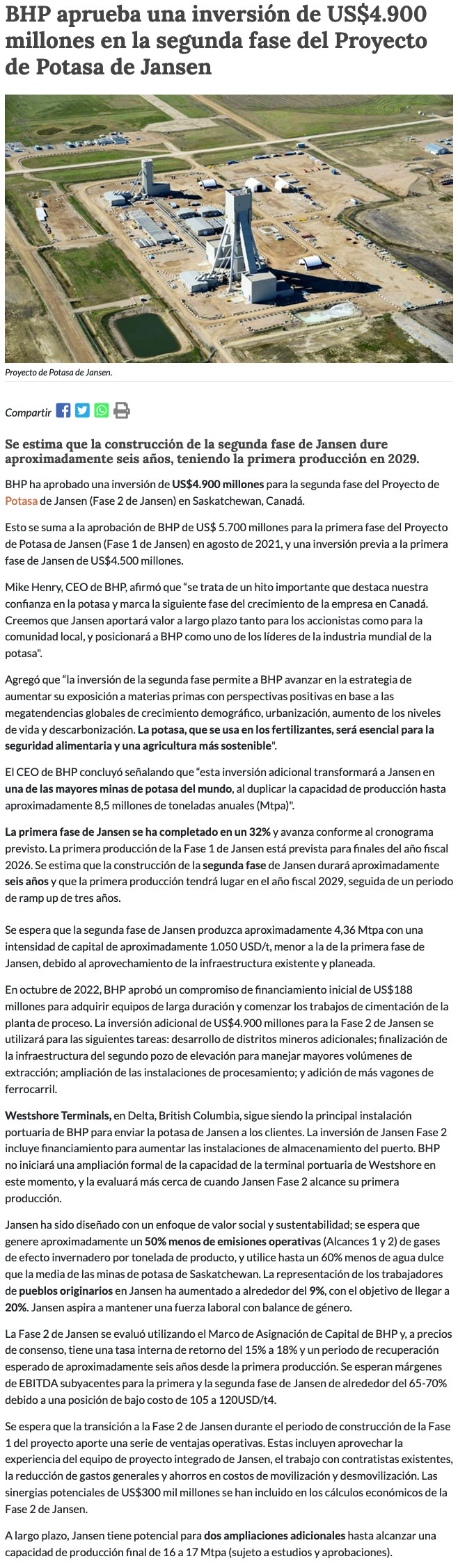 BHP aprueba inversión de US$ 4.900 millones en proyecto de potasio en Canadá - (DF Online)