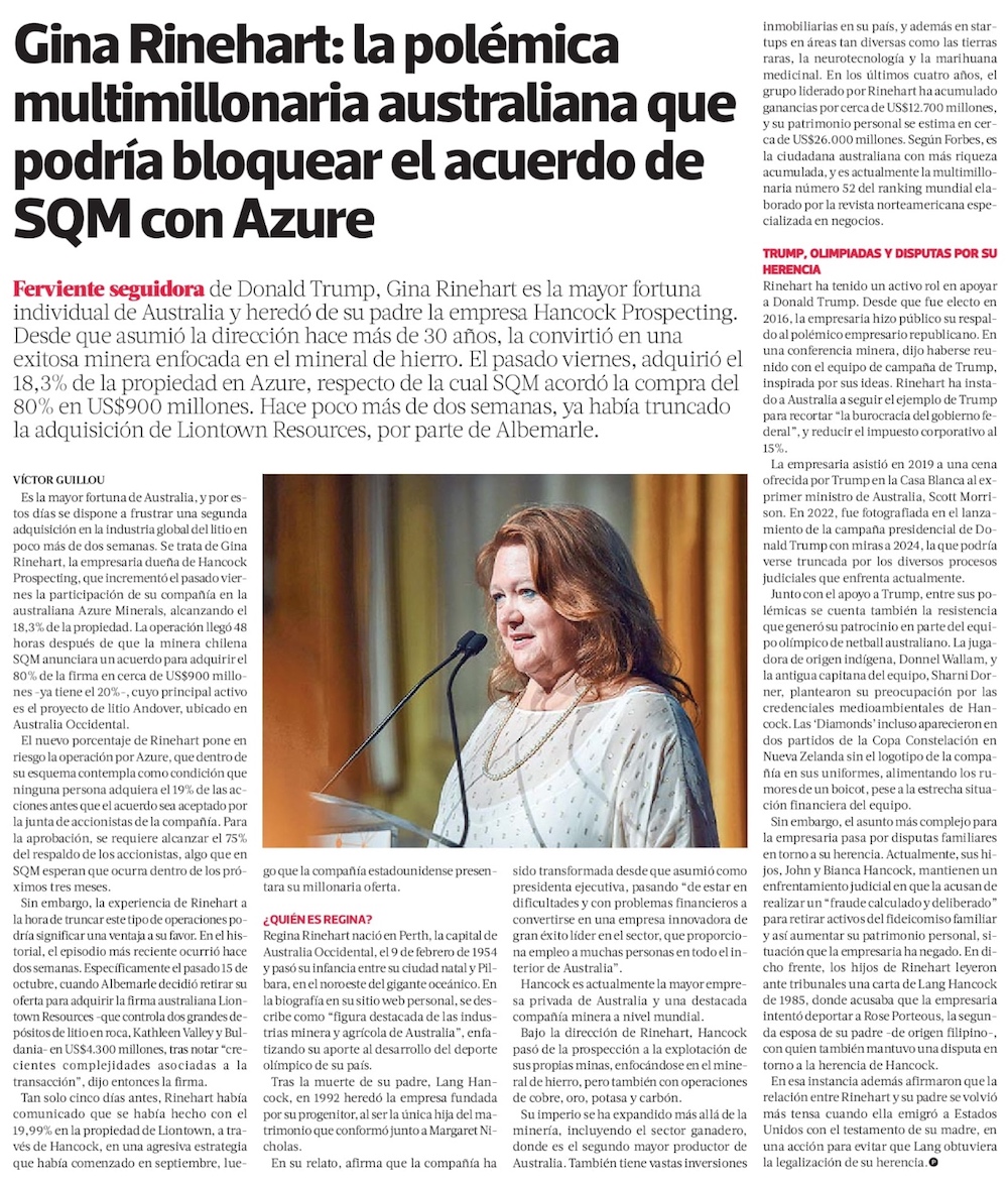 Gina Rinehart, la “dama de hierro”: La inesperada y poderosa rival de SQM en Australia - (La Segunda)