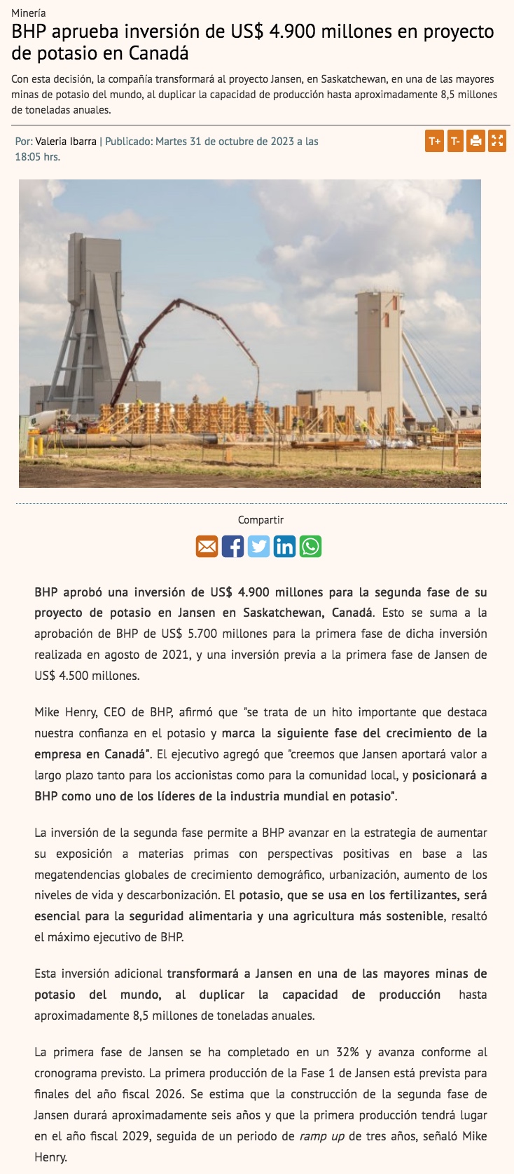 BHP aprueba una inversión de US$4.900 millones en la segunda fase del Proyecto de Potasa de Jansen - (reporteminero)