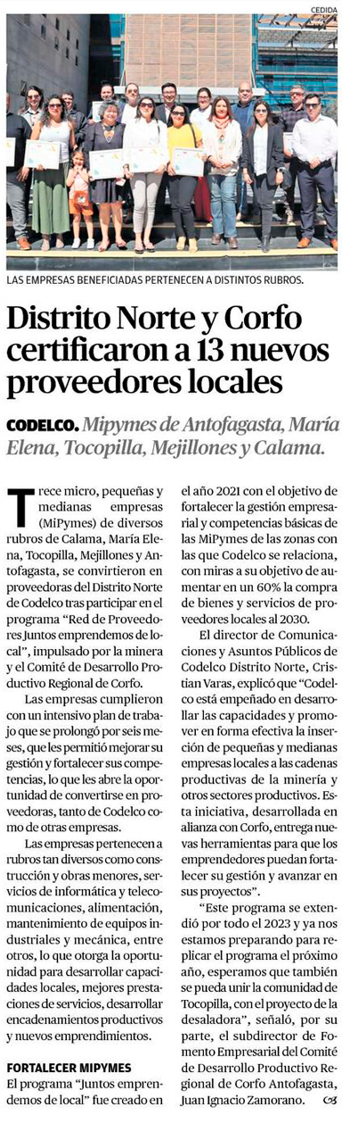 Codelco y Corfo certificaron a 13 nuevos proveedores locales - (elamerica)