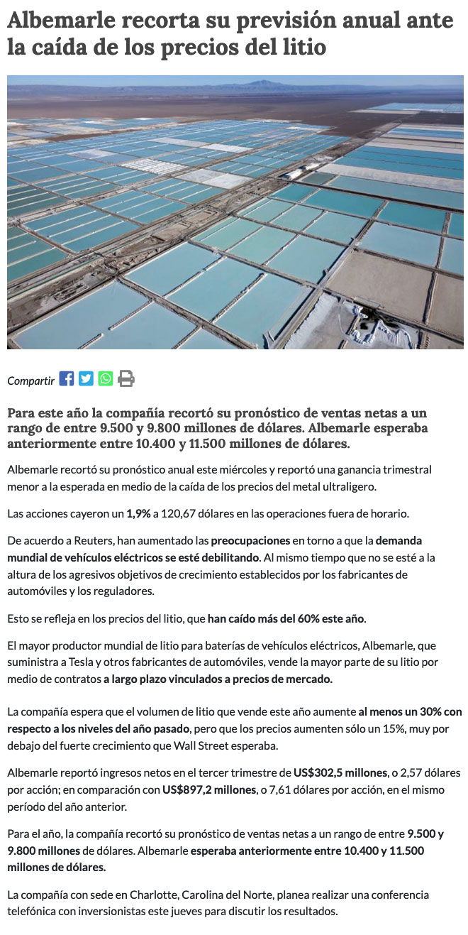 Albemarle: caĆda del litio pone en peligro el suministro - (El Mercurio de Santiago)