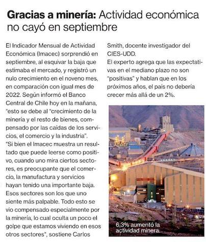 Minería evita caída de Imacec en septiembre, pero analistas apuntan a economía estancada - (El Mercurio de Santiago)