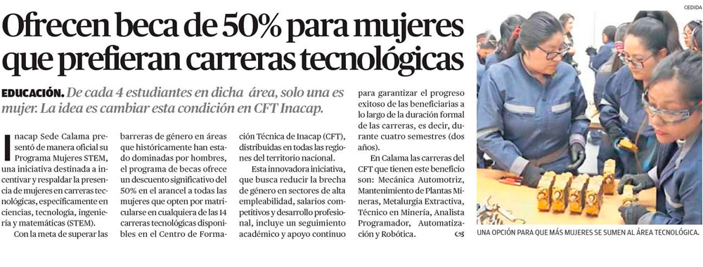 INACAP Calama anuncia Beca por toda la carrera para mujeres que prefieran carreras del área tecnológica - (enlalinea)