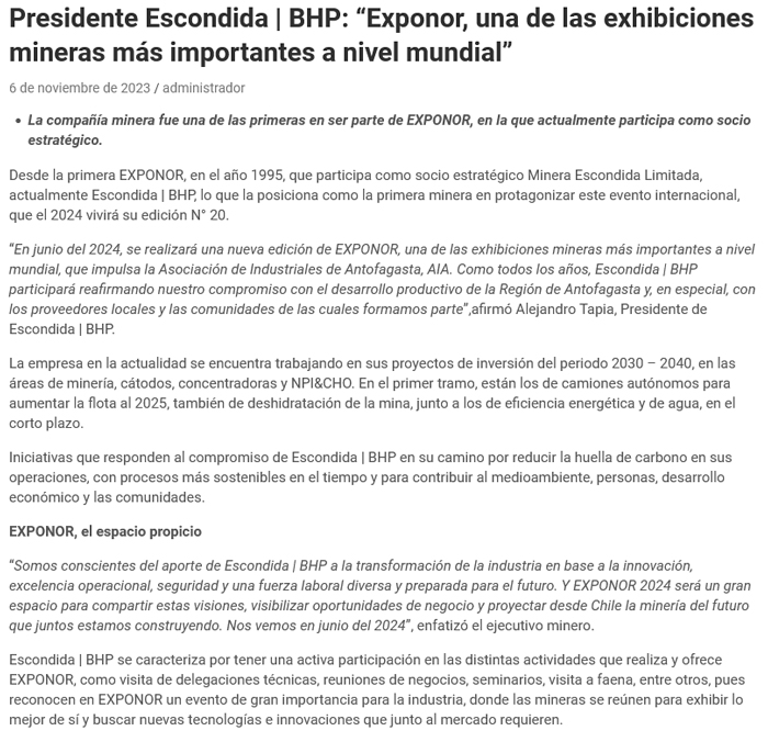 Presidente Escondida | BHP: “EXPONOR, una de las exhibiciones mineras más importantes a nivel mundial” - (regionesnoticias.cl)
