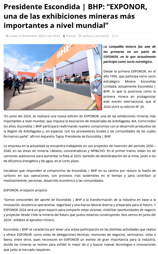 Presidente Escondida | BHP: “EXPONOR, una de las exhibiciones mineras más importantes a nivel mundial” - (antofagastanoticias)