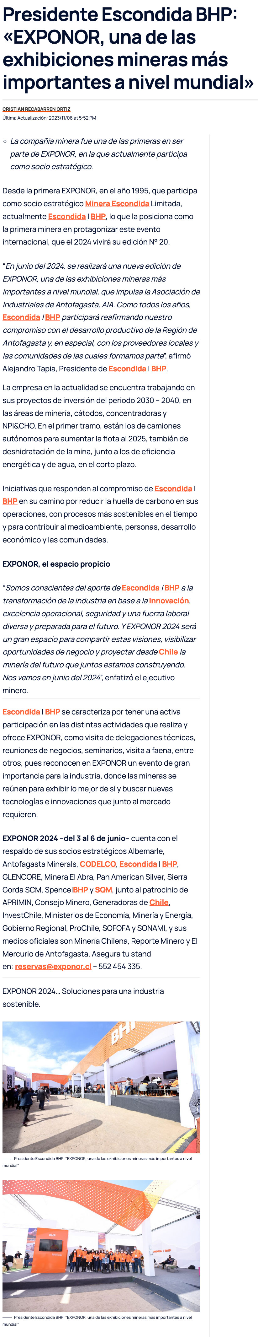 Presidente Escondida | BHP: “EXPONOR, una de las exhibiciones mineras más importantes a nivel mundial” - (regionesnoticias.cl)