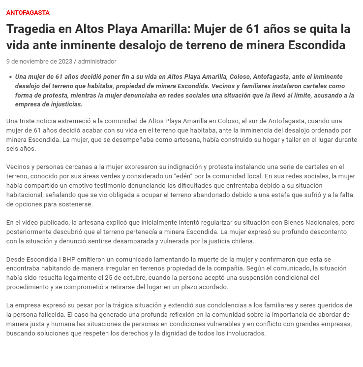 “Me quitaron mi Edén”: Mujer se habría quitado la vida ante inminente desalojo de terreno perteneciente a Minera Escondida en Antofagasta - (diarioantofagasta)