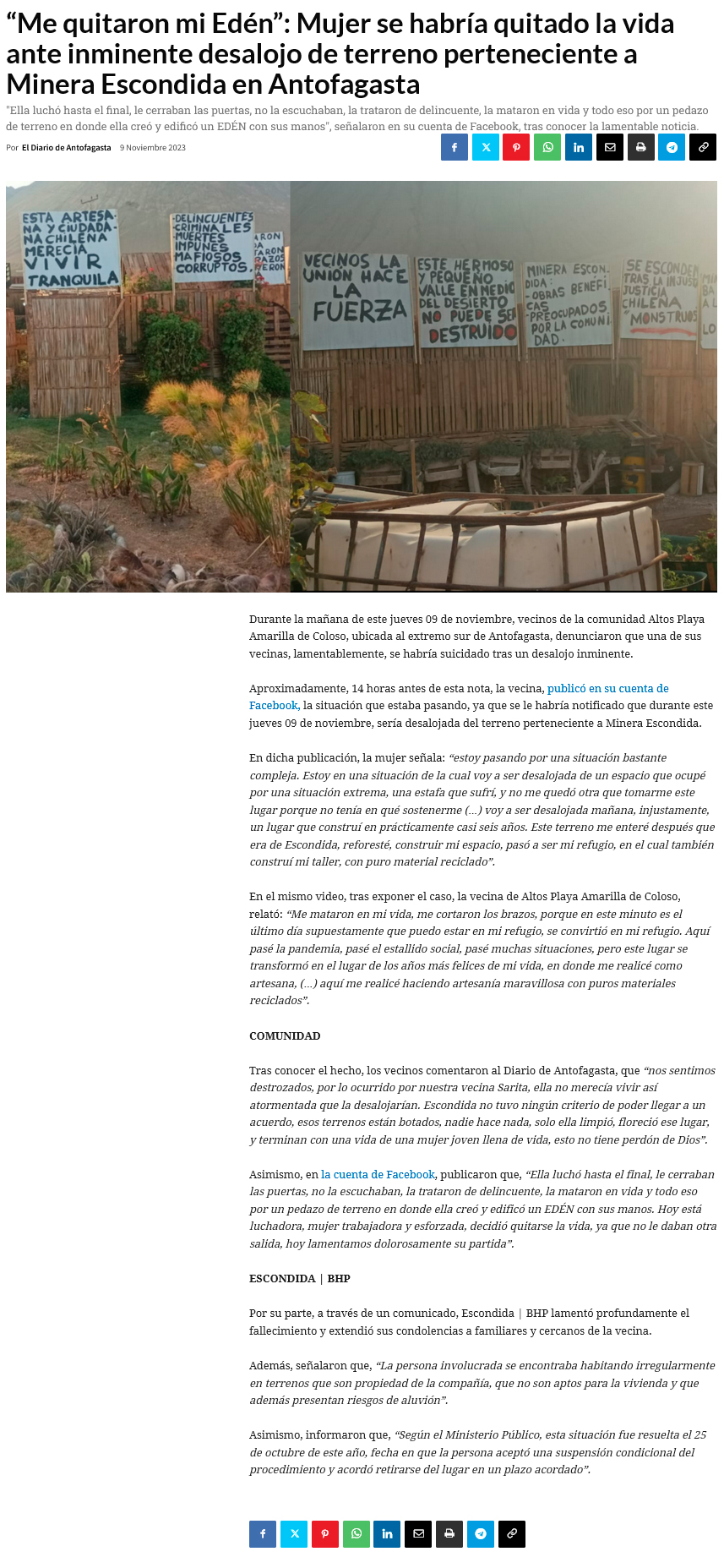 Antofagasta: Vecina de Coloso se habría quitado la vida ante inminente desalojo por parte de Minera Escondida - (elregionalista)