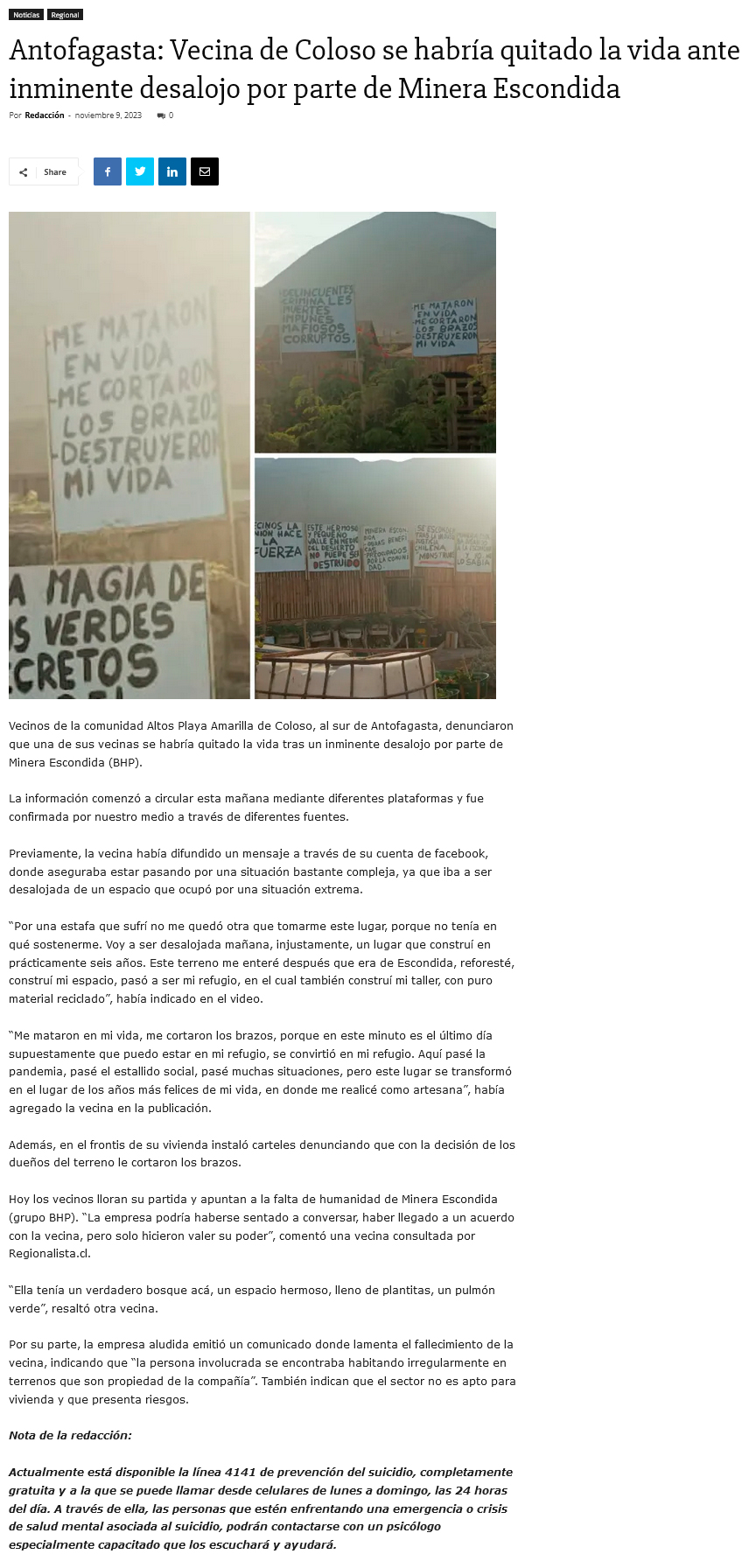 “Me quitaron mi Edén”: Mujer se habría quitado la vida ante inminente desalojo de terreno perteneciente a Minera Escondida en Antofagasta - (diarioantofagasta)