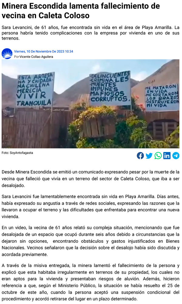 Duras críticas a minera Escondida tras muerte de vecina que iba a ser desalojada de terreno en Coloso - (regionalista.cl)