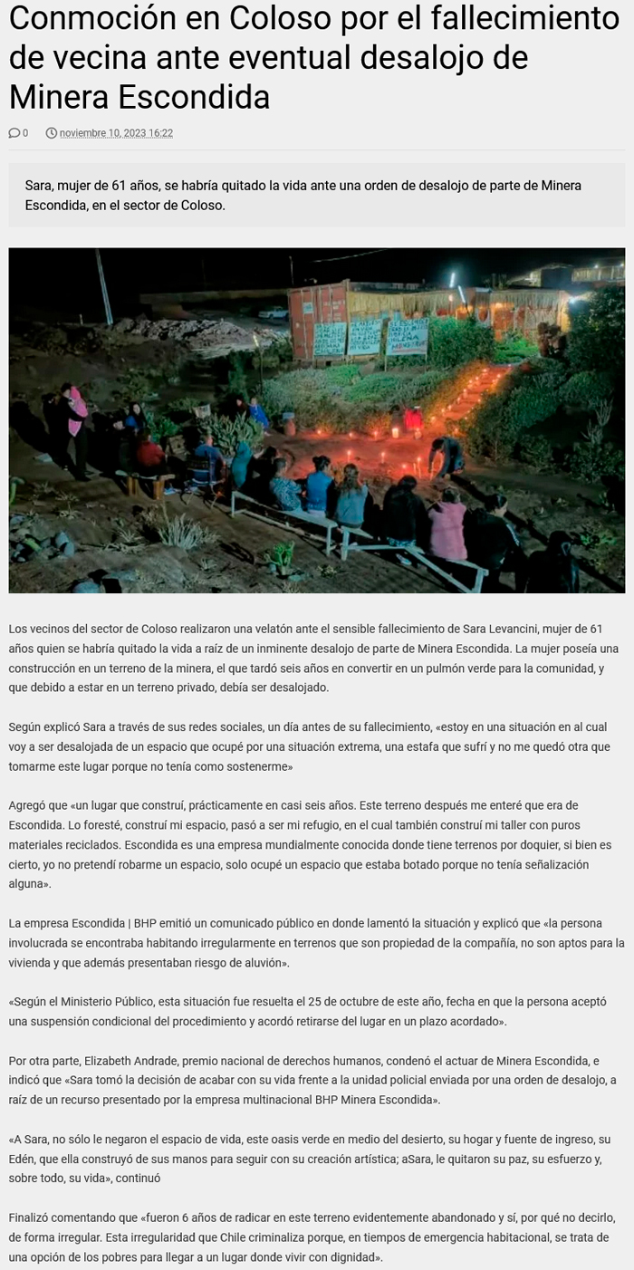Duras críticas a minera Escondida tras muerte de vecina que iba a ser desalojada de terreno en Coloso - (elregionalista)