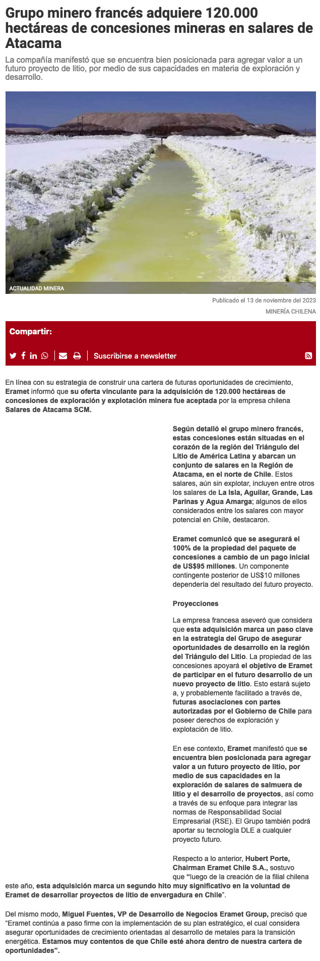 El grupo minero francés Eramet adquiere 120.000 has de concesiones mineras en 7 salares de la región de Atacama - (Nostálgica Online)